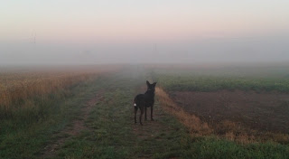Heute geht meine Rundköpfin dann mit mir raus und kündigt schon an, dass wir mal nach dem Stilzchen Ausschau halten. Super Idee. Soweit. Und dann macht sie wieder so etwas, wo jeder mit ein bisschen Grips im Kopf sich fragt, was das wohl soll. Da geht sie über's Feld, aufrecht wie sie nunmal geht, die Nase damit viiiieeel zu bodenentfernt, und zu allem Überfluss hält sie sich dabei die Hand vor die Augen. Von all den unterentwickelten Sinnen, die dem Mensche so eigen, sind ihm die Augen aber die wichtigsten Hilfsmittel zum Suchen. Ich bin verwundert und halte mich hinter ihr, um zu beobachten, was sie vorhat oder wie sie so etwas finden will.