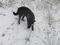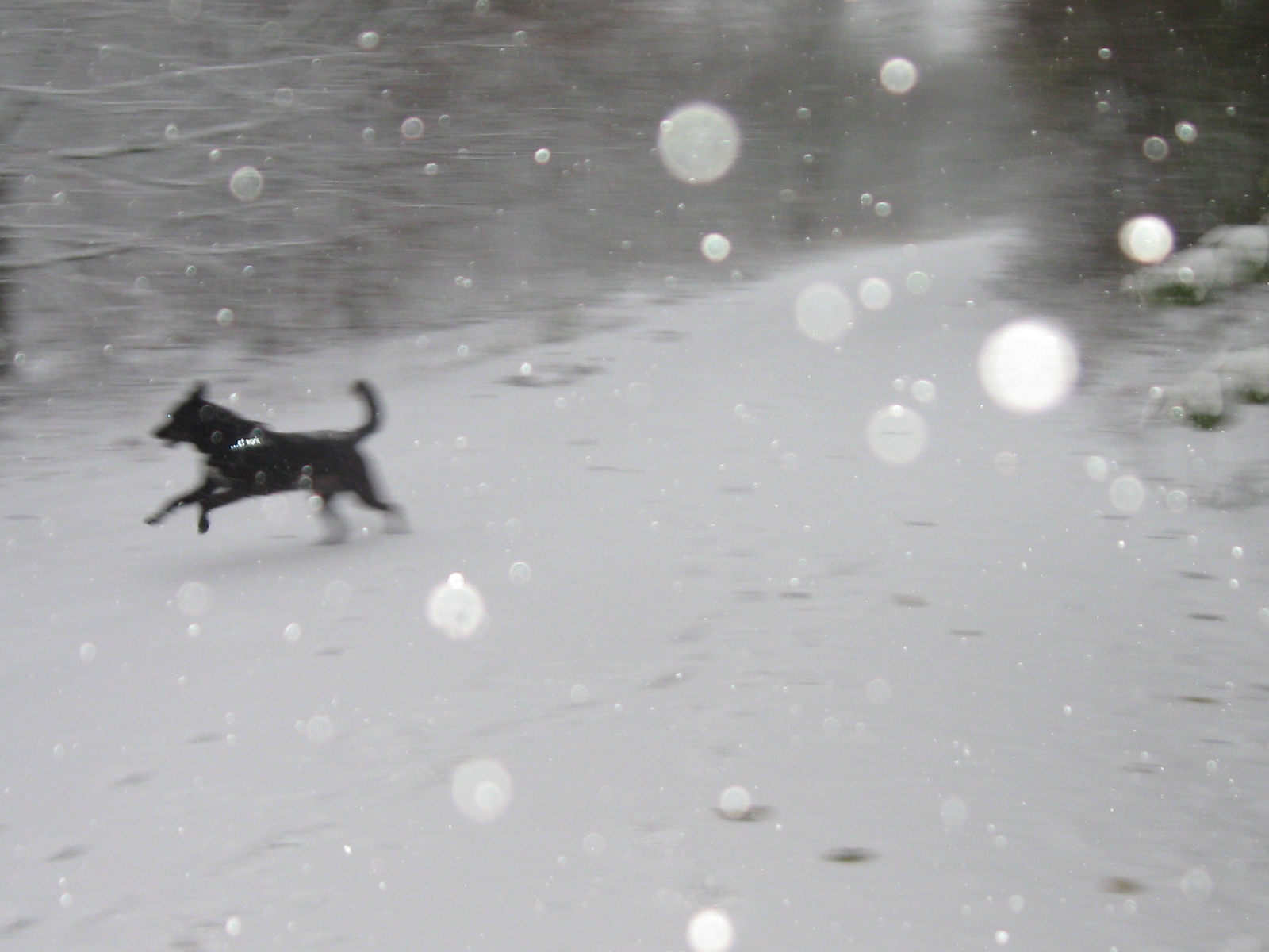 An der Haustür dann die Überraschung! Was ist das!!?? Ein weißer Teppich, der ziemlich kalt riecht und wirkt. Ich bin erstmal stehen geblieben. Die Zw'einerin ist aber ganz selbstverständlich raus gegangen und da habe ich mich auch getraut. Kalt war es tatsächlich. Nach ein paar Nasenstübern in den Weiß-Kalt-Teppich wollte ich dann mal los hopsen.... huiuiui, das war aber rutschig. Also lag ich erstmal auf'm Gesicht. Fand der Rundkopf natürlich sehr spaßig. Aber dann sind wir gemeinsam los gehopst und hatten mächtig Spaß. Den Teppich kann man (wenn man Greifhände hat) ganz leicht aufheben und formen. Plötzlich flog mir so ein Bällchen um die Ohren und als ich es schnappen und damit spielen wollte, war's weg. Da kam auch schon das nächste geflogen und es dämmerte mir: Die will spielen und zeigt mir gerade ein ganz neues Spiel - Bällchenschlacht. Wir also weiter gehopst - sie formend und werfend, ich schnappend und lustig aussehend.