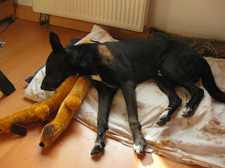 Auf jeden Fall musste ich vor den meisten neuen Erlebnissen gar nicht so viel Angst haben und habe mich da sehr tapfer geschlagen. Irgendwann war ich sogar recht entspannt - ein toller Erfolg! Und anstrengend, wenn auch im positiven Sinne - so viele Zw'einer, die alle komisch riechen, die ganzen anderen fremden Gerüche und Geräusche, laute Musik, unvertraute Umgebung, zum Schluss der kleine Stinker (nicht böse sein Kumpel, aber du warst 'n bisschen unfreundlich, ich wollte doch nur spielen ;-)), das ganze wuselige Hin und Her, überall Hände und Füße, ....